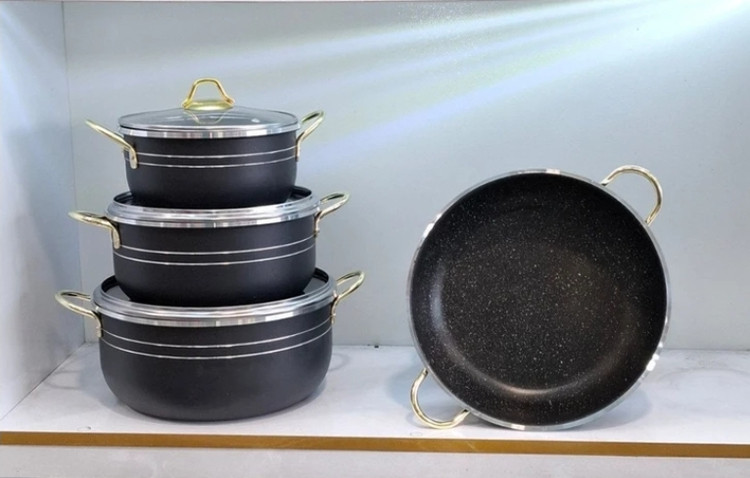 سرویس 7 پارچه طرح چدن داخل گرانیتی دسته طلایی،سرویس قابلمه،ست قابلمه و تابه
